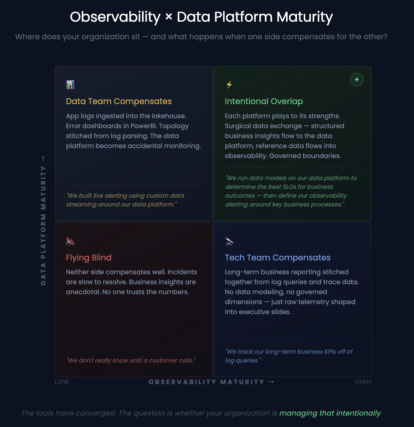 These aren't one-time decisions. They require your observability and data organizations to continuously evaluate where work should live — and your business stakeholders to be part of that conversation. The tools have converged. The question is whether your organization is managing that intentionally.